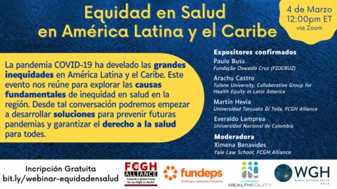 The upcoming webinar “Equidad y Salud en América Latina”, co-sponsored by the FCGH Alliance, SHEM, fundeps, and the WGH. This will take place on 4th of March, at 12 pm ET, via Zoom. The event is free and it will be recorded, and you can sign-up at bit.ly/webinar-equidadensalud