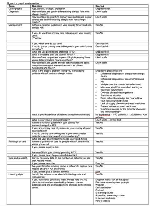 Background: Multiple studies have highlighted teaching and learning needs about rhinitis. IPCRG’s research needs prioritisation (1) highlights two questions with over 80% consensus: 1. What tools could help the primary care clinician differentiate between allergic and non-allergic rhinitis, rhinosinusitis, common cold and other clinically similar conditions? 2. What are the best clinical tools to monitor asthmatic and allergic children in primary care in LMICs? Additionally, studies of GPs and pharmacists show significant gaps in competence and confidence. (2,3) IPCRG plans to address these gaps including a global situational analysis and learning needs assessment. It seeks feedback on its design. Methodology: 1. Following peer review and pilot, questionnaire to be (See outline Fig 1) distributed to all IPCRG contacts through mailing lists, member countries and other networks e.g. WONCA, FIP and ICRN linking to a Google form. 2. Questionnaire will address diagnosis, management, care pathways, data and research availability and preferred learning style. 3. Analysis by country, age, gender and profession 4. Consideration of results by IPCRG’s education committee to inform response. References: 1. Abdel-Aal A et al. Prioritising primary care respiratory research needs: results from the 2020 International Primary Care Respiratory Group (IPCRG) global e-Delphi exercise. npj Prim. Care Respir. Med. 32, 6 (2022). https://doi.org/10.1038/s41533-021-00266-4 2. Ryan D et al. Results of an allergy educational needs questionnaire for primary care. Allergy. 2017 Jul;72(7):1123-1128. doi: 10.1111/all.13134 3. Scheire S et al. Rhinitis Control and Medication Use in a Real-World Sample of Patients with Persistent Rhinitis or Rhinosinusitis: A Community Pharmacy Study. J Allergy Clin Immunol Pract. 2024 Jul;12(7):1865-1876.e6. doi: 10.1016/j.jaip.2024.04.031. Funding: The IPCRG self-funded the development of the research idea; it has secured funding from ALK to support the distribution of the questionnaire if it is decided to go ahead.