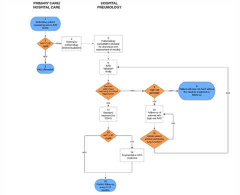 The care of a person with AATD is complex, with different needs identified and many challenges still ahead. For this reason, it is proposed to prepare this document, so that it can help any of the doctors involved in making decisions, from diagnosis to follow-up, with a comprehensive perspective between the services of pulmonology, primary care, nursing, hospital pharmacy, also including the patient's vision.