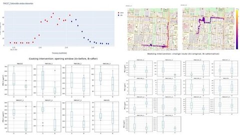 Methodology: Cooking Indoors - The protocol for cooking was standardised to toasting a single slice of white bread in a pan in a closed kitchen. The kitchen window was opened once the toast was overdone and started smoking. The scatterplot (Fig1-top-left) illustrates the rise and fall of PM2.5 values pre- and post-intervention (in red and blue colours).