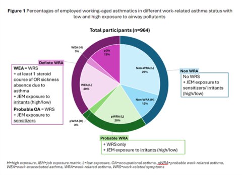 Methods: We invited employed working-aged asthmatics from 27 English GP practices (n=763), NIHR Be-Part-of-Research Scheme (n=789) and other workplaces (n=62) between March 2023-March 2024. Data were collected by questionnaire including items on demographics, asthma control and treatment, employment characteristics, work exposures, WRS, Brief-illness perception questionnaire, EQ-5D, Hospital-anxiety-and-depression scale, absenteeism, Stanford presenteeism scale, and Minnesota satisfaction questionnaire. Occupations were mapped to ISCO-88 and OAs-JEM (job exposure matrix) to determine exposure to inhaled pollutants. WEA defined as having work-related symptoms with ≥1 steroid course or ≥1 absenteeism in last 12 months. Logistic regression was used to examine relationships between relevant variables and diagnoses in different settings.