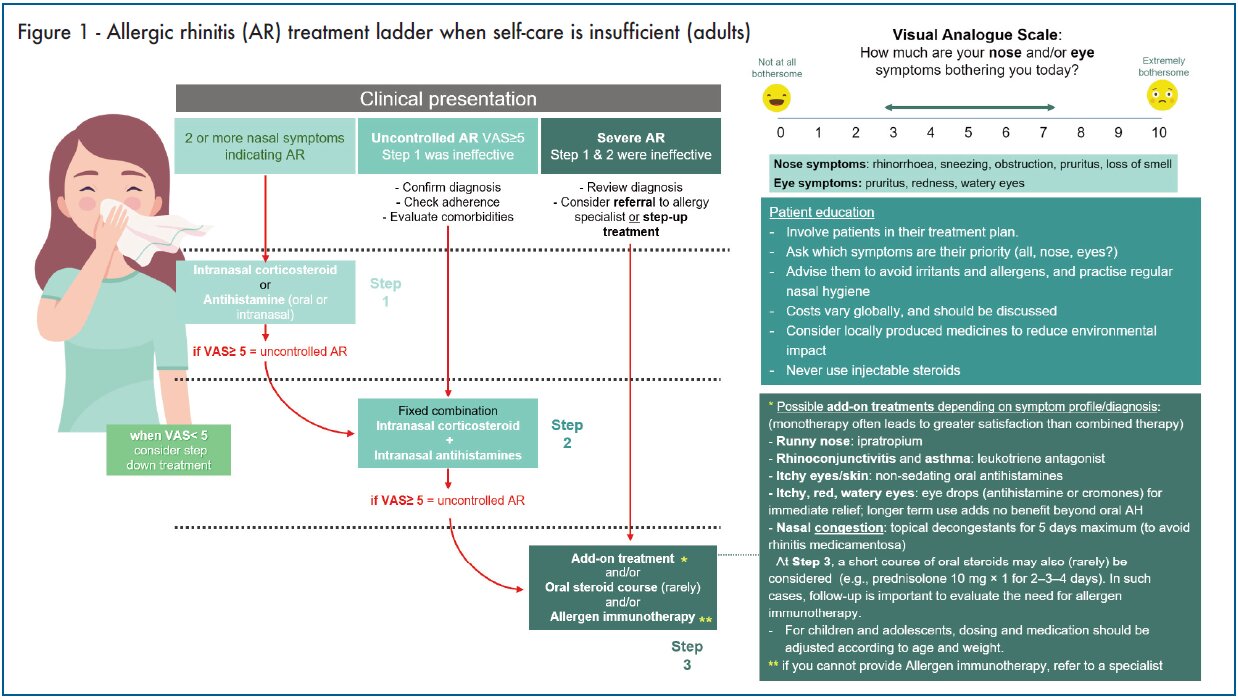- Lourenço O, Cvetkovski B, Kritikos V, House R, Scheire S, Costa EM, Fonseca JA, Menditto E, Bedbrook A, Bialek S, Briedis V, Boussery K, Canonica GW, Haahtela T, Kuna P, Mullol J, Orlando V, Samolinski B, Wallace D, Duggan C, Paulino E, Pinto GS, Söderlund LÅ, Bousquet J, Bosnic-Anticevich S. Management of allergic rhinitis symptoms in the pharmacy Pocket guide 2022. Clin Transl Allergy. 2022 Oct 5;12(10):e12183. doi: 10.1002/clt2.12183. PMID: 36225265; PMCID: PMC9533218.