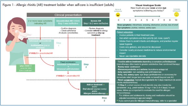 Pharmacist-led interventions enhance adherence and clinical outcomes. Pharmacists can ensure the correct use of intranasal inhalers/sprays, which is key to achieving therapeutic efficacy and symptom relief, and support patients to manage their condition more effectively. This role becomes even more important in the context of switching from prescription to over-the-counter (OTC) therapies, where pharmacist-led guidance is likely to be the only professional support persons with rhinitis receive. Viral acute rhinosinusitis, in particular, can often be effectively managed at the pharmacy level through symptom relief and the promotion of self-care.(30-33)