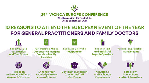 WONCA Europe's 2024 Conference will take place from 25-28 September in Dublin, Ireland. Click here to find out more.