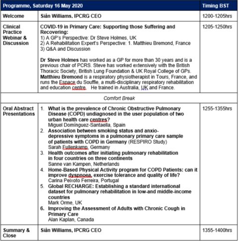 These webinars are free and open to the primary care respiratory academic community and all respiratory interested primary care healthcare professionals. They offer the primary care respiratory community the opportunity to discuss and debate current COVID-19 challenges. These virtual sessions also offer a platform to the authors, who successfully submitted abstracts for the postponed IPCRG 10th World Conference, the chance to share their work with the wider international respiratory community.