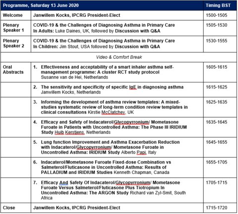 Prof Huib Kerstjens, Netherlands will present the results of the IRIDIUM study, which assessed the lung function, asthma control and exacerbation outcomes with IND/GLY/MF medium- and high-dose once-daily (o.d.) versus the respective IND/MF doses o.d. and salmeterol xinafoate /fluticasone propionate (SAL/FLU) high-dose twice-daily (b.i.d.), in patients with uncontrolled asthma.
