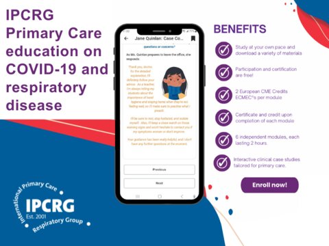 Our new accredited case-based e-learning course 'Primary Care Education on COVID-19 and Respiratory Disease' is now open for registration. The course addresses the needs of primary care health professionals who face a fast-changing environment following the COVID-19 pandemic. Enrol in this course featuring six modules developed by leading IPCRG experts. The course is open to all: participation and certification are free.
