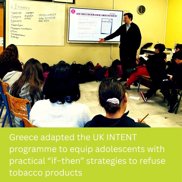 With strong school partnerships and a teacher-led delivery model, the adapted INTENT intervention shows promise as a scalable approach to adolescent tobacco prevention within Greece’s education system.